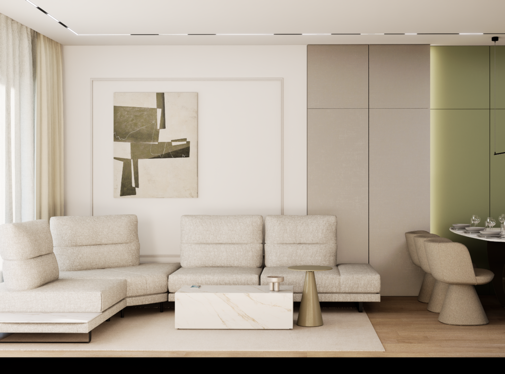 Dnevni boravak, trpezarija i kuhinja su povezani u jedinstven, fluidan prostor. Modularna garnitura otvara pogled prema eksterijeru. Kuhinja je dizajnirana…