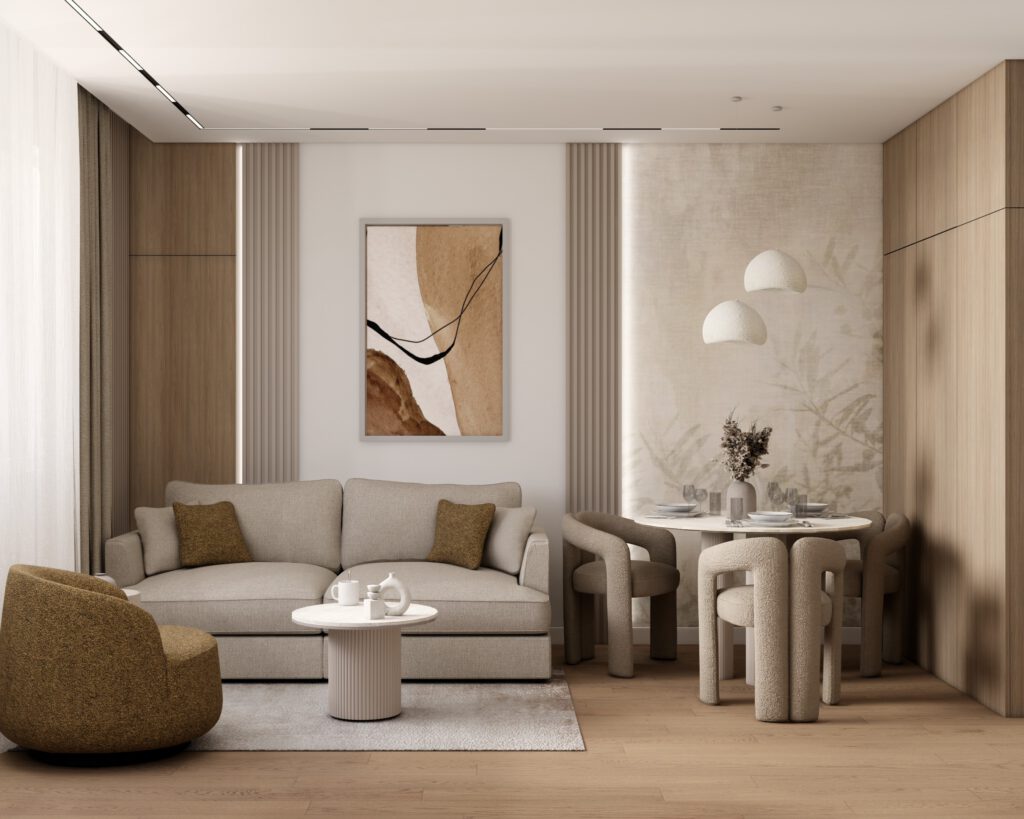 Enterijer ovog stana predstavlja primjer savremenog toplog minimalizma, koji vješto kombinuje čiste linije modernog dizajna sa udobnošću i prirodnom toplinom.…