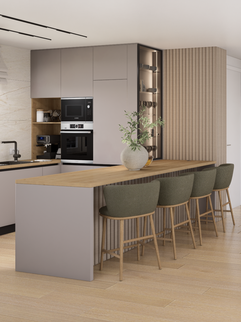 Kuhinja u kojoj se jednostavnost kašmir sive susreće sa toplinom svijetlog hrasta. Vertikalne letvice na šanku i zidu unose dinamiku,…